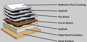 Built Up roofs, a continuous, semi-flexible multi-ply roof membrane, consisting of plies or layers of saturated felts, coated felts, fabrics, or mats between which alternate layers of bitumen are applied. Generally, built-up roof membranes are surfaced with mineral aggregate and bitumen, a liquid-applied coating, or a granule-surfaced cap sheet. The choice to cover with rock or coat with a variety of cool roof product is also available.